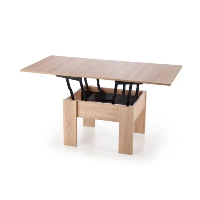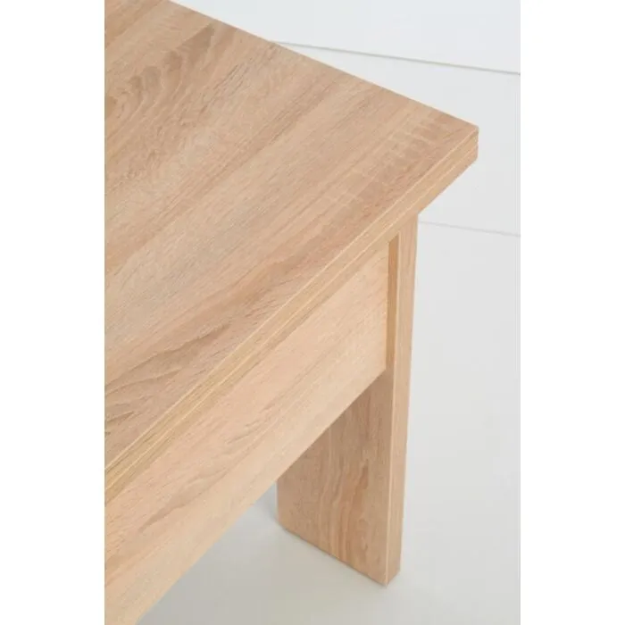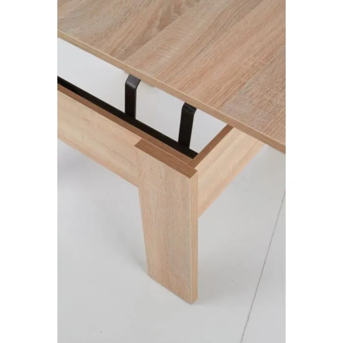 Klubska miza FINN je zelo kvalitetna in stabilna. Prednost te edinstvene mizice je ta, da se mizica lahko enostavno dvigne in raztegne. Narejena je v celoti iz laminirane iverne plošče. Primerna je za vsako dnevno sobo. Dobavljiva je v barvi hrast sonoma, kot je na sliki.