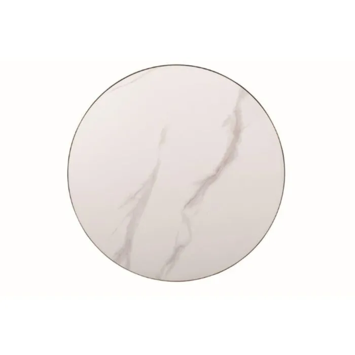 Klubska miza GELI je modernega dizajna. Mizna plošča je narejena iz keramike v videzu marmorja, bele barve. Mizno podnožje je narejeno iz kovine v črni mat barvi, z detajlom v videzu brušenega zlata.