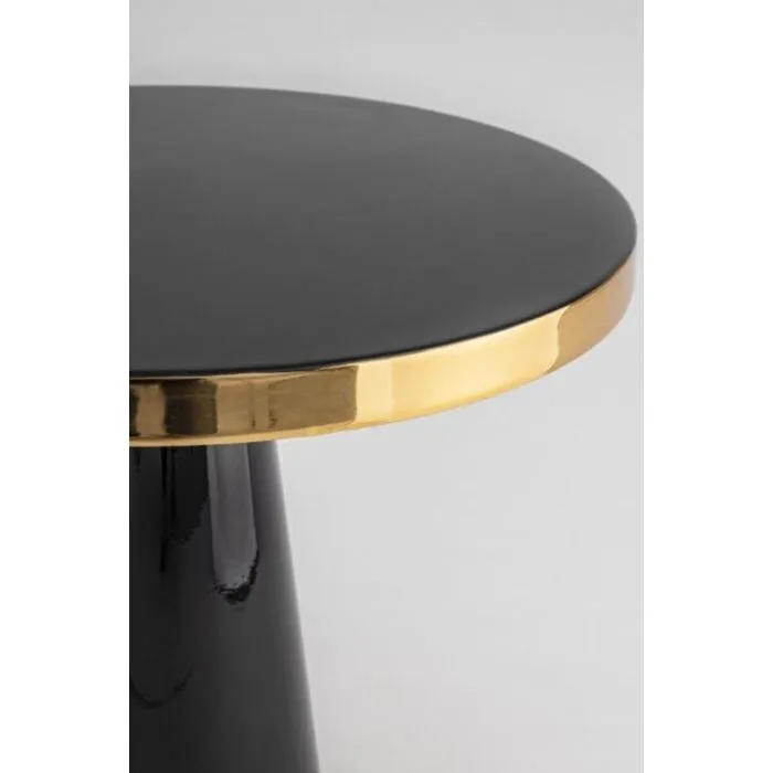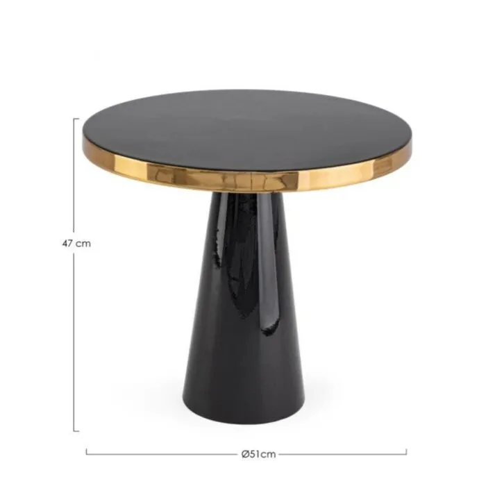 Klubska miza NANDIKA D51 črna ima kovinski okvir ter zgornji rob z medeninastim zaključkom. Je v črni barvi z zlatim dodatkom. Odlično se poda v vsak prostor, ne glede na to ali je to gostinski obrat, hotelski ambient ali pa vaša dnevna soba.
