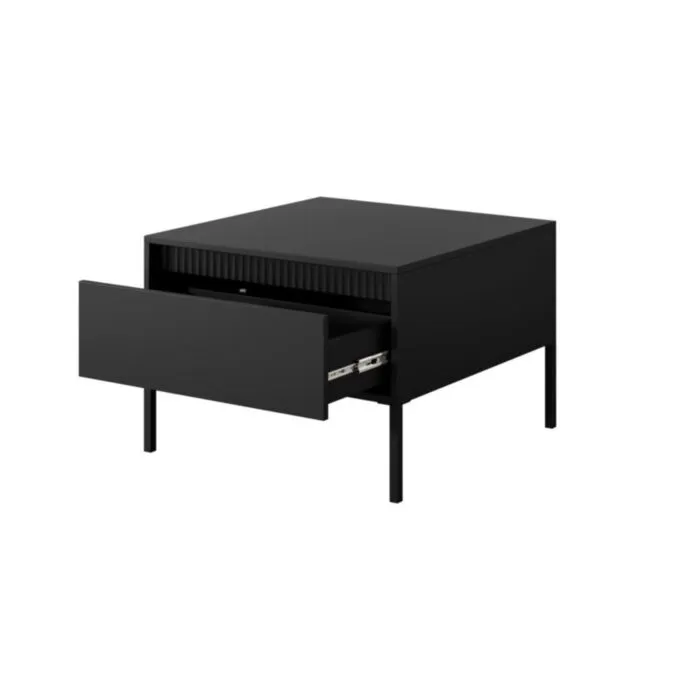 Klubska mizica FIFIJA, je eleganten kos pohištva, ki popestri vaš prostor s svojim luksuznim dizajnom. Narejen je iz kakovostnih materialov v črni barvi. Izdelan je iz MDF-ja in ABS robov. Ima kovinske nogice v črni barvi. Ima mehko zapiranje. Ima poseben rebrasti dizajn, ki popestri vaš prostor.