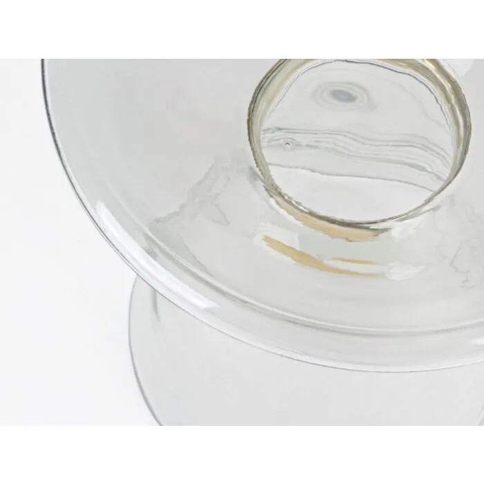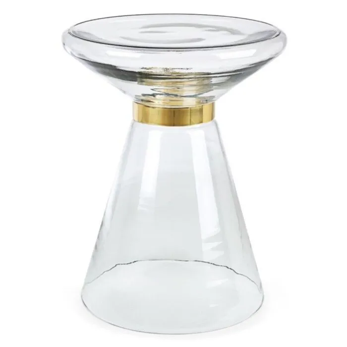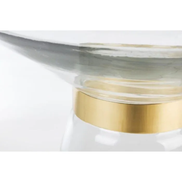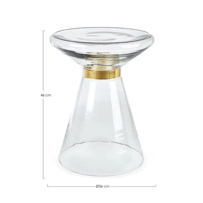 Klubska mizica MERIEL D36 ima stekleni okvir z krasnim obročkom in prrekritim vrhom iz jekla, zlate barve.