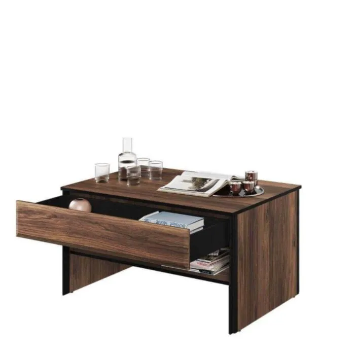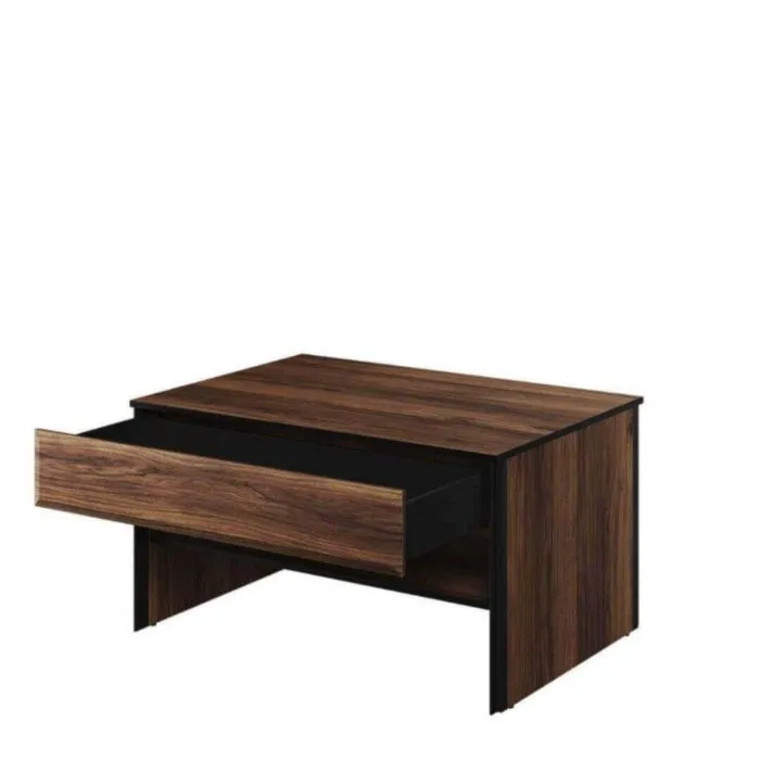 Klubska mizica NAT in predal ter polico. Kombinacija črnega in temnega lesnega dekorja deluje modno in elegantno, hkrati pa v notranjost vnese veliko prijetne topline.