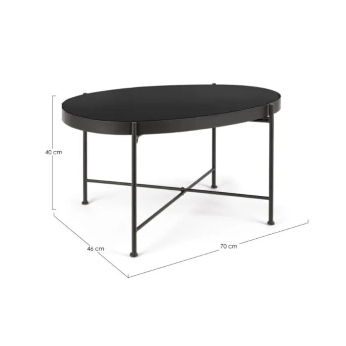 Klubska mizica RASHIDA 70×46 črna ima kovinski okvir in stekleni vrh. Ima štiri stabilne nogice, ki doprinesejo eleganco.