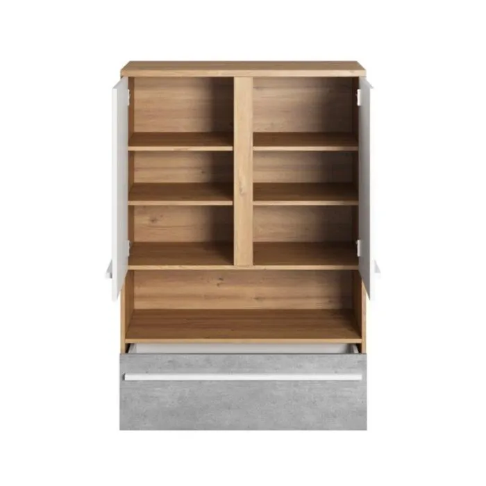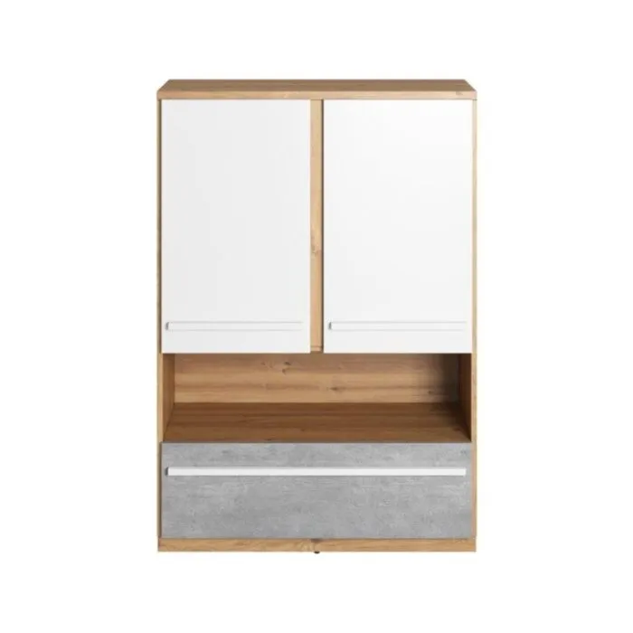 Knjižna omara IRE 3 je dvovratna omara s predalom ter nišo. Je zelo praktična in odlikuje jo premišljena funkcionalna razporeditev. Zahvaljujoč vratom, ki so enostavna za uporabo, lahko v omarico spravite na primer garderobno omaro in šolske potrebščine. V niši boste lahko razstavili knjige, okraske in pospravili pogosto uporabljene predmete. Čisto na dnu je prostoren, lahko dostopen predal, kamor lahko udobno shranite igrače ali oblačila. Odlično izstopajo zaradi kombinacije barve lesa, univerzalne sive ter modno bele barve. Narejena je iz laminirane iverne plošče debeline 16 mm.