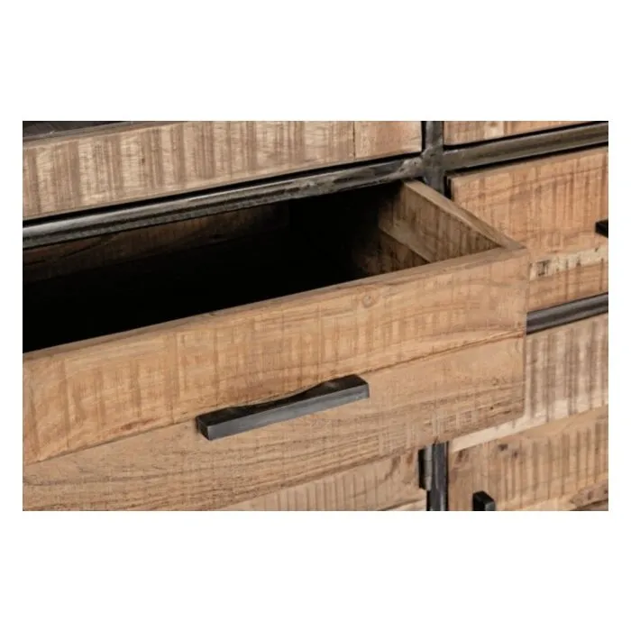 Komoda 6A-3C ELMER ima okvir iz lesa, noge so iz kovine v črni barvi. Ker je okvir obdelan ročno, so oblike in velikosti ki jih tvori les, samo okvirne, vsi vzorci se bodo med drugimi razlikovali.
