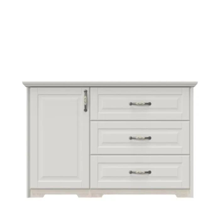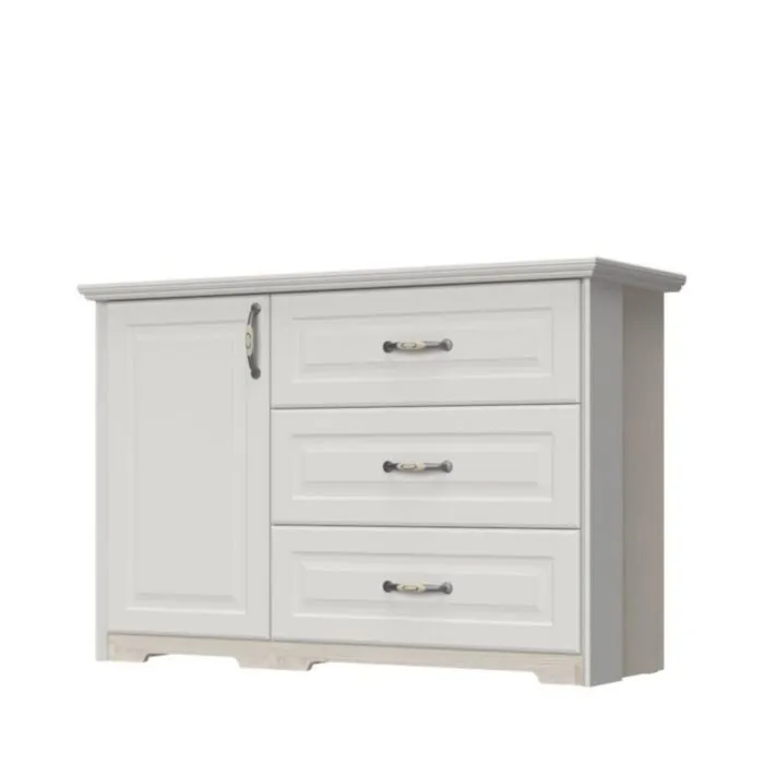 Komoda ALOJA, je eleganten kos pohištva, ki popestri vsak prostor. Komoda ima tri funkcionalne, rustikalne in elegantne predale in vrata, katera imajo v notranjosti eno polico. Profilirane fronte so narejene iz mediapana lakiranega z UV lakom, kar zagotavlja trpežnost in dolgo življensko dobo komode.