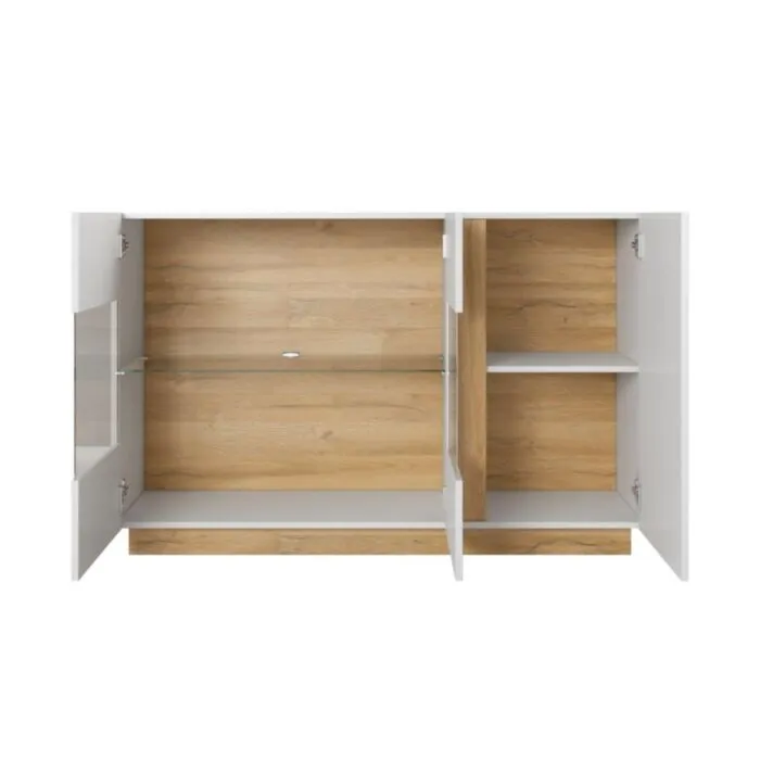 Uporabna in praktična komoda AREK 2. Primerna je za dnevne sobe in jedilnice. Narejena je iz vrhunskih materialov v EU. Komoda ima mehanizem “PUSH TO OPEN” za odpiranje. Komoda je na voljo v beli visoki sijaj barvi, v kombinaciji s hrastom.