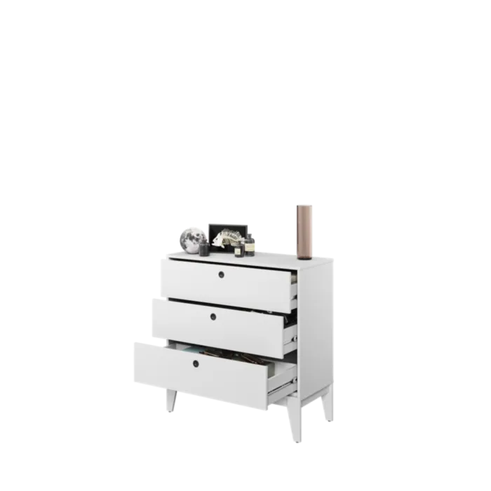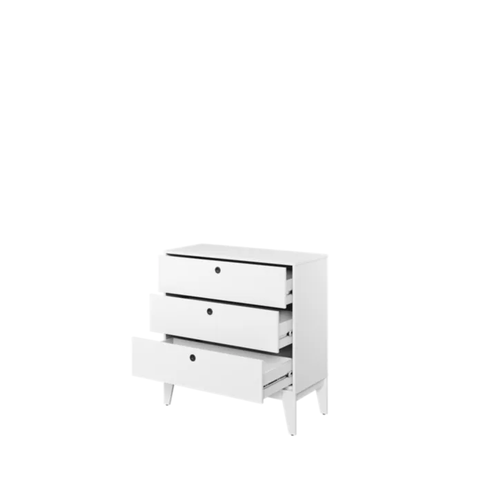 Komoda FAMA 2 je narejena iz kvalitetne laminirane plošče s ABS robovi. Dobavljiva je v beli mat barvi s črnimi ročaji. Odlično se kombinira s ostalimi izdelki iz kolekcije FAMA.