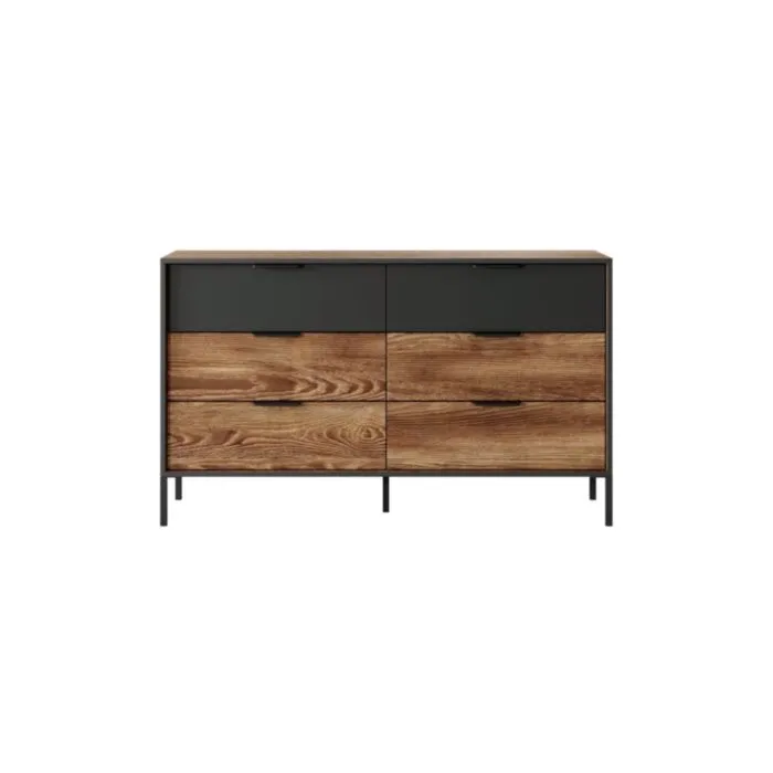 Komoda HILTON je izvirna in stilska. Vsebuje harmonijo čudovitih dekorjev barv: antracit in kostanj. Komoda vsebuje zajetne predale. Izdelana je iz kvalitetne laminirane plošče z ABS robovi. Vsebuje črne kovinske ročaje.