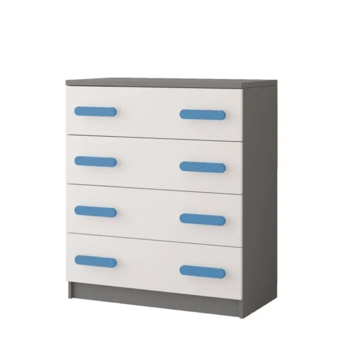 Komoda LIVIJA  2  je primerna za vse mladinske in otroške sobe. Miza je narejena iz laminirane plošče debeline 16mm z ABS robovi, ročaji so leseni. Miza je dobavljiva v sivi barvi, fronta je v beli barvi in ročaji so modri.