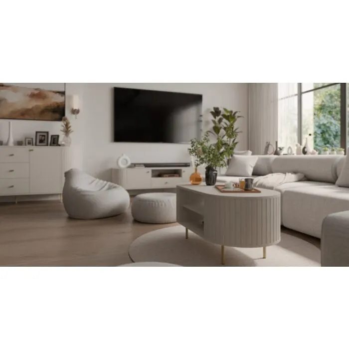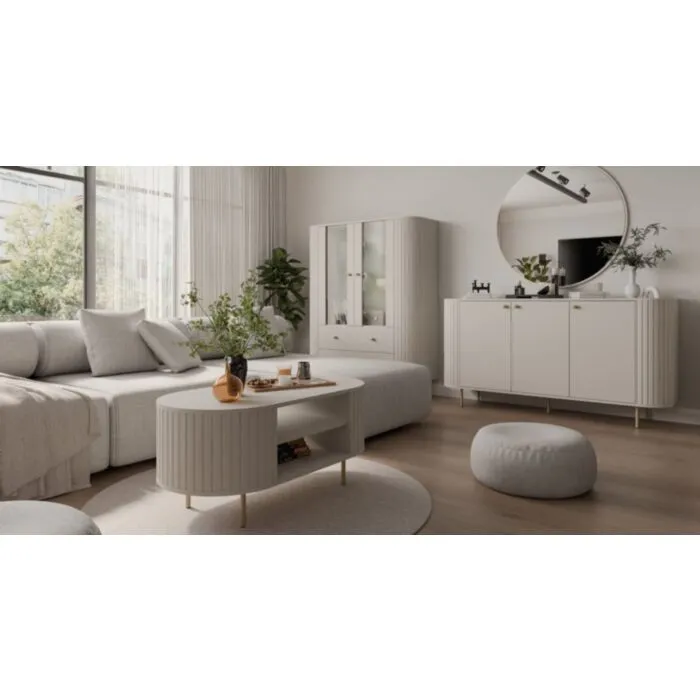 Komoda OVARI je zaradi svoje oblike in visokokakovostnih materialov trpežna in vzdržljiva. Odporna je na praske, udarce in obrabo. Je enostavna za vzdrževanje, saj je površina preprosta za čiščenje in negovanje. Estetsko se poda v vsak prostor ter ima dobro odpornost na madeže in vlago. Dobavljiva je v bež barvi z nežnimi zlatimi nogicami in ročaji. Na levi in desni strani ima vrata v notranjosti pa sta dva prostorna prostora za shrnajevanje. Na sredini ima tri predale, kar dodatno pripomore k njeni funkcionalnosti.