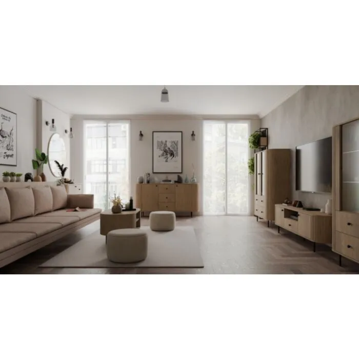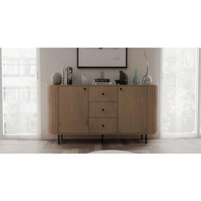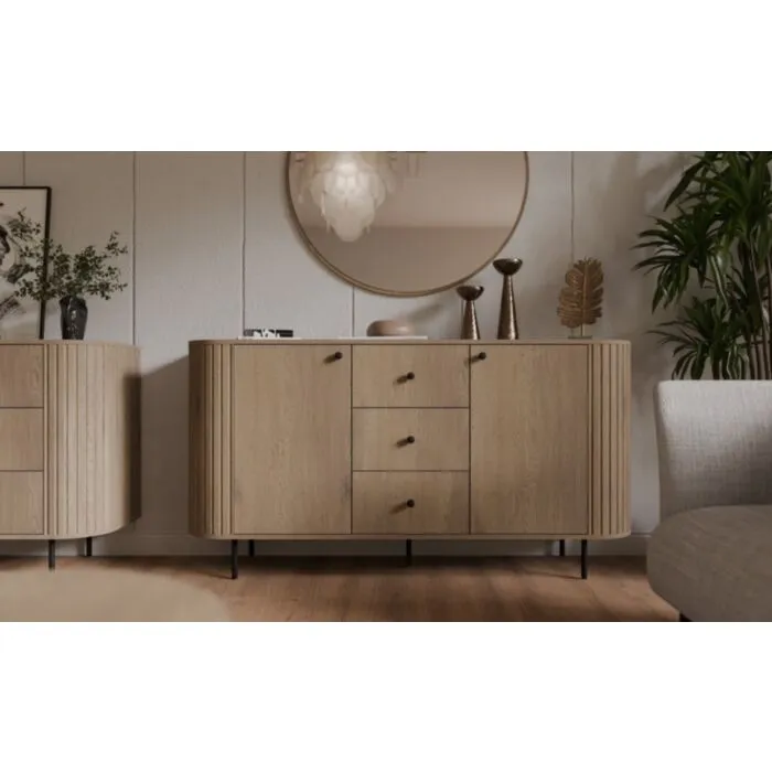 Komoda OVARI hrast je zaradi svoje oblike in visokokakovostnih materialov trpežna in vzdržljiva. Odporna je na praske, udarce in obrabo. Je enostavna za vzdrževanje, saj je površina preprosta za čiščenje in negovanje. Estetsko se poda v vsak prostor ter ima dobro odpornost na madeže in vlago. Dobavljiva je v hrast barvi. Na levi in desni strani ima vrata v notranjosti pa sta dva prostorna prostora za shranjevanje. Na sredini ima tri predale, kar dodatno pripomore k njeni funkcionalnosti.