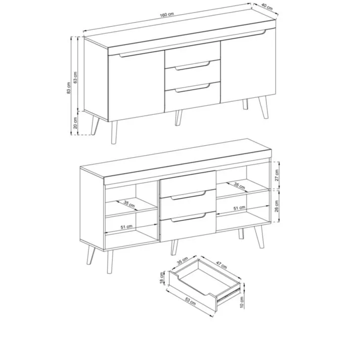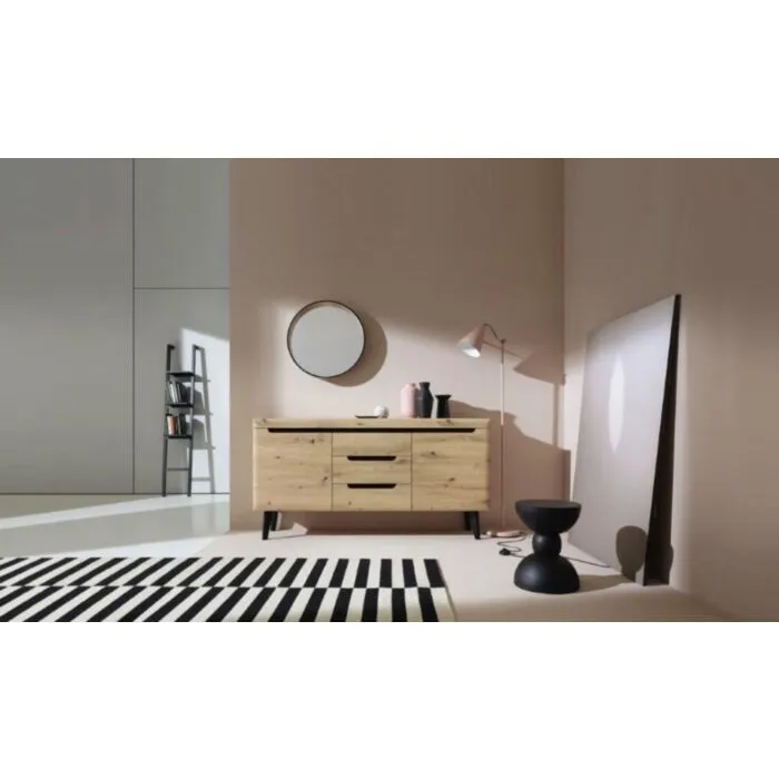 Komoda RON2 160 v skandinavskem slogu bo popestrila vaš bivalni prostor. Dobavljiva je v kombinaciji hrasta in črne barve. Površina kmode je izdelana iz MDF plošče z ABS robovi. Komodo lahko kombinirate z ostalimi izdelki iz serije RON.
