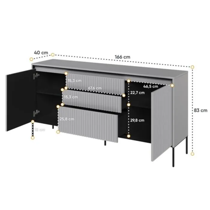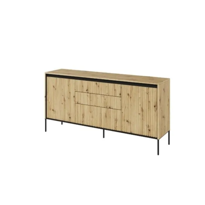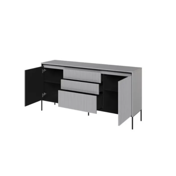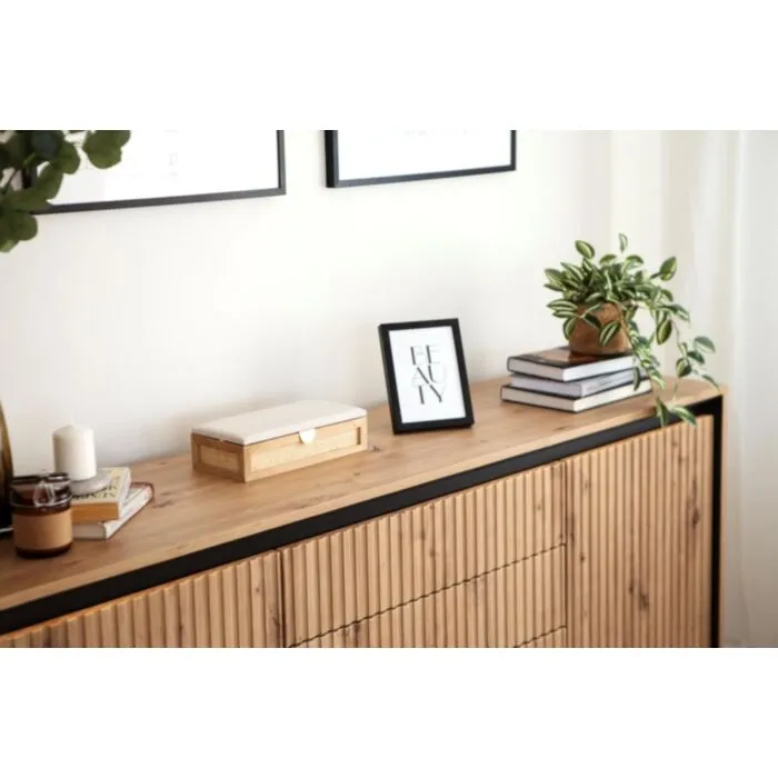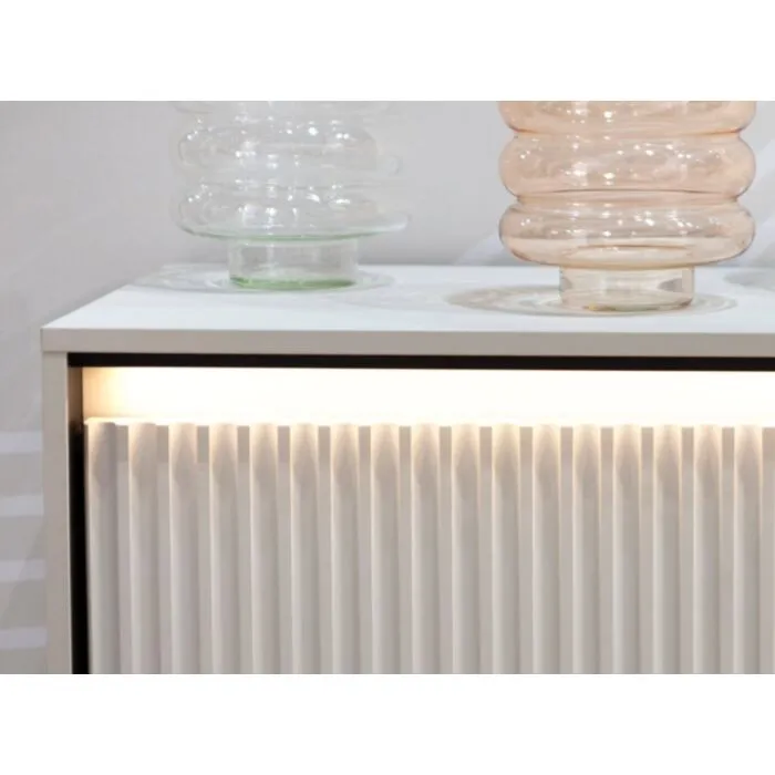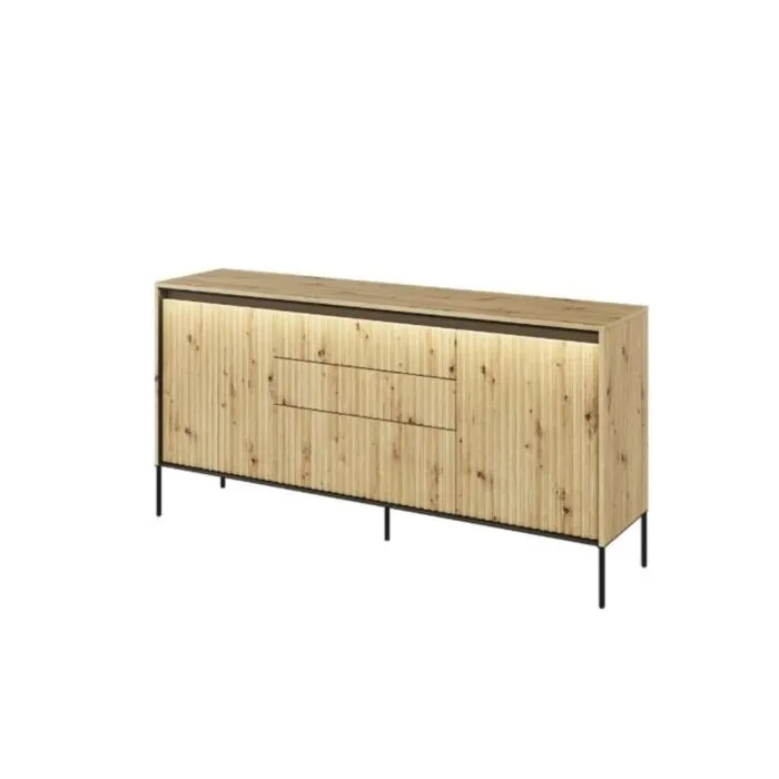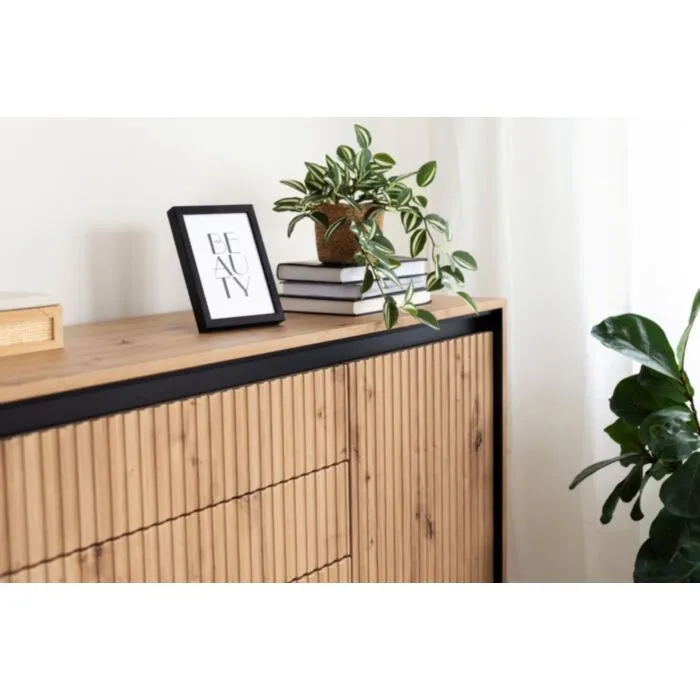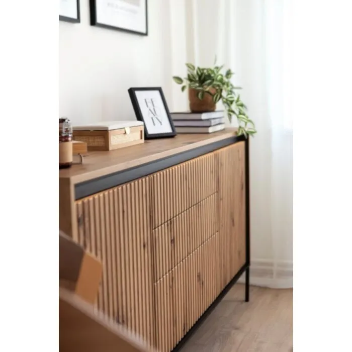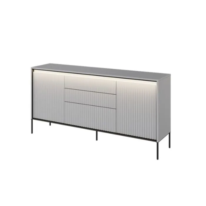 Komoda TERA, združuje funkcionalnost z izjemnim dizajnom. Komoda ne bo le zadovoljila vaših potreb po shranjevanju, temveč bo pritegnila pozornost tudi s svojim edinstvenim slogom. Njeno obliko in eleganten dizajn dodatno poudarja LED osvetlitev. Ta edinstven vzorec doda komodi edinstven značaj. Ima predale, kateri so idealni za shranjevanje različnih stvari, oblek ali drugih pomembnih stvari.