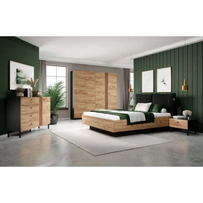 Kompletna spalnica GALIJA vas bo očarala s svojimi toplimi barvami skandinavskega hrasta v kombinaciji s kontrastno antracit barvo, ki bodo vašo spalnico naredile prostor blizu narave. Dopolnitev je oblazinjeno vzglavje postelje, obogateno z zanimivo obliko osvetlitve LED luči. Spalnica GALIJA vam bo omogočila ureditev prostorov, ki so funkcionalni in praktični ter hkrati izžarevajo mir in harmonijo. Kompletna spalnica GALIJA je narejena iz kvalitetne laminirane plošče z ABS robovi. Vsebuje črno/zlate kovinske ročaje ter oblazinjen vzglavnik.