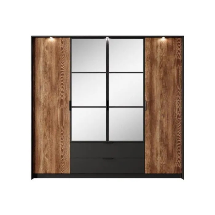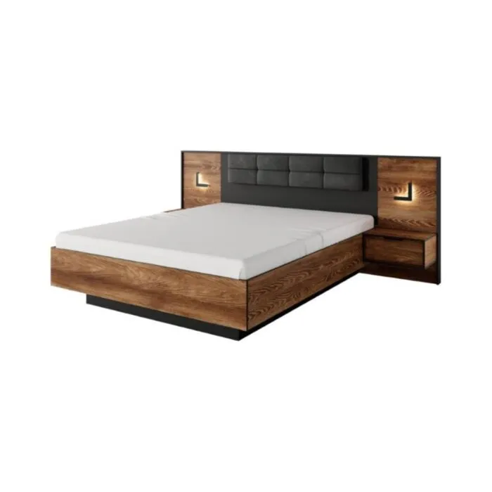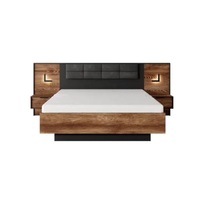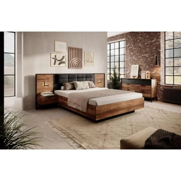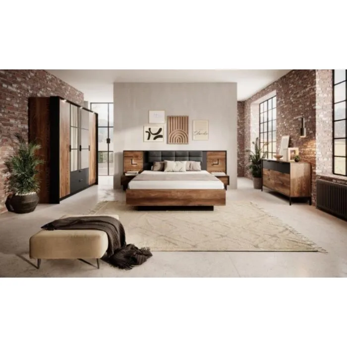 Kompletna spalnica HILTON je izvirna, stilska ter z značajem pohištvo. Spalnica, ki bo zagotovila odličen okras. Vsebuje harmonijo čudovitih dekorjev barv: antracit in kostanj. Garderobna omara je opremljena z ogledali, praktičnimi predali in LED osvetlitvijo, komoda vsebuje zajetne predale in izjemno udobna postelja z delno oblazinjenim vzglavjem s šivi in zanimivo osvetlitvijo, tvorijo popoln komplet modernosti s pridihom starega značaja. Kompletna spalnica HILTON je izdelana iz kvalitetne laminirane plošče s ABS robovi. Vsebuje črne kovinske ročaje ter LED osvetlitev v garderobni omari ter nočnih omaricah.