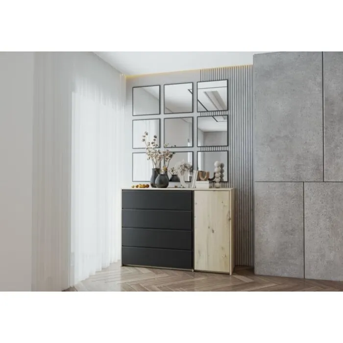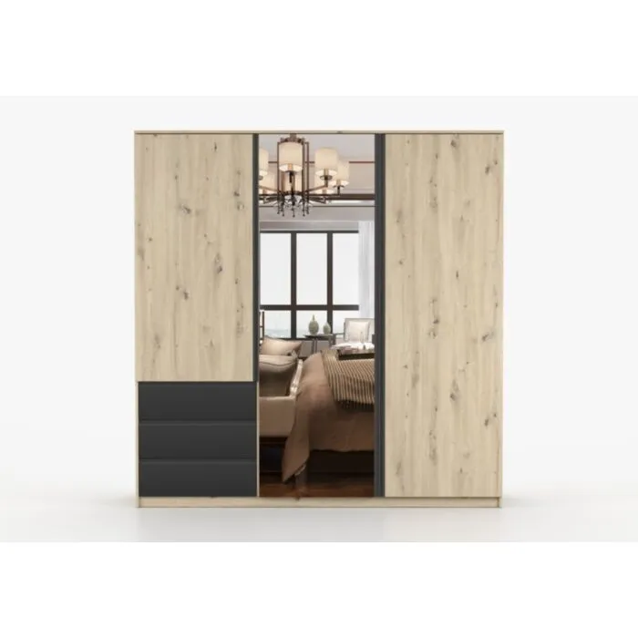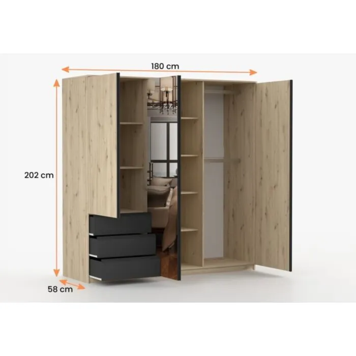 Garderobna omara ima veliko ogledalo, v notranjosti na levi strani je opremljena s tremi prostornimi predali. Pod predali ima tri prostorne črne predale za shranjevanje vseh oblačil in predmetov, ki jih želite imeti organizirane. Na sredini ima prostorne police. Na desni strani pa velik prostor za obešanje in shranjevanje vaših najljubših kosov. Nočna omarica je opremljena z dvema prostornima predaloma. Zaradi svoje barve in kompaktne dimenzije se prilega v vsak prostor. Kompletna spalnica je narejena iz kakovostne laminirane plošče debelne 16 mm. V ceno sta vključeni dve nočni omarici.
