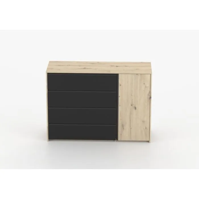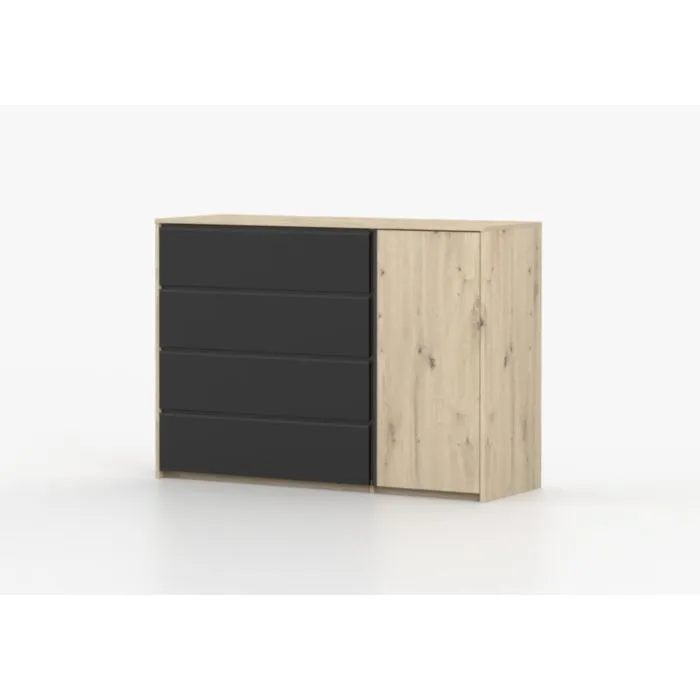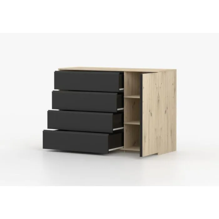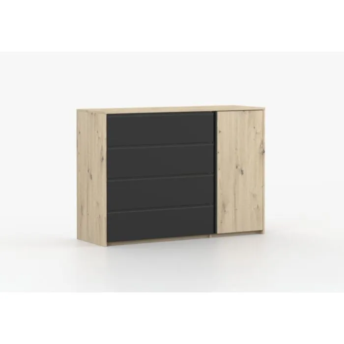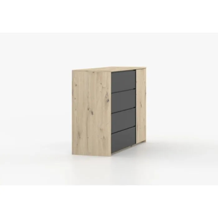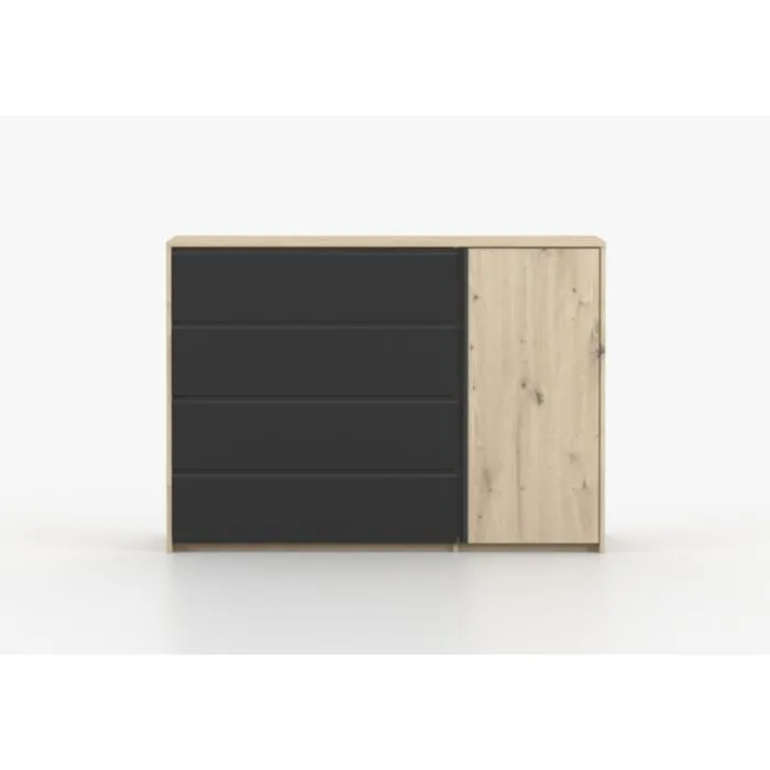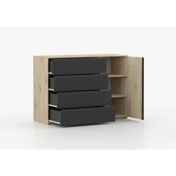 Kompletna spalnica LANZAROTE je sestavljena iz kar štirih velikih, prostornih elementov: postelje 160×200, komode, garderobne omare in dveh nočnih omaric. Postelja je moderen kos pohištva. Je odlična izbira za vsako tradicionalno ali moderno spalnico. Elegantna oblika v modnih barvah se bo odlično podala v vsak aranžma. Dodatna prednost sta trdna izdelava in udobje pri spanju. Postelja je kakovostna in trpežna. V ceno je vključen posteljni pod. Komodo lahko postavite v dnevno sobo, spalnico, hodnik ali garderobo. Opremljena je s štirimi prostornimi predali in globokimi policami.