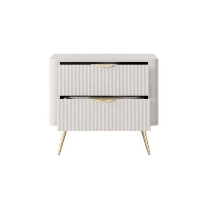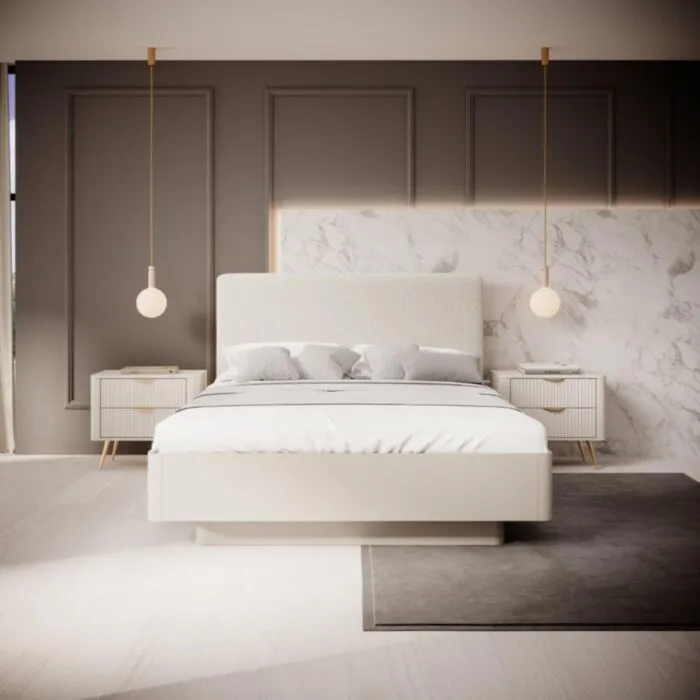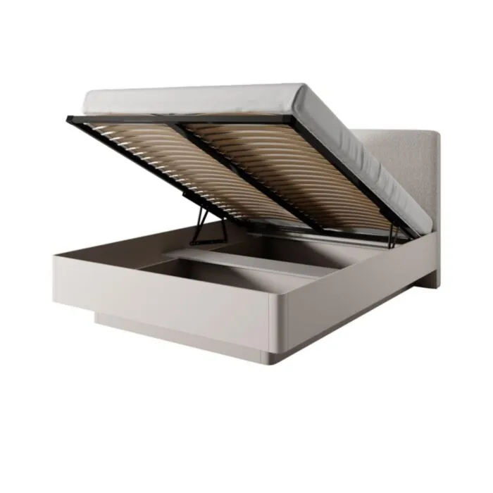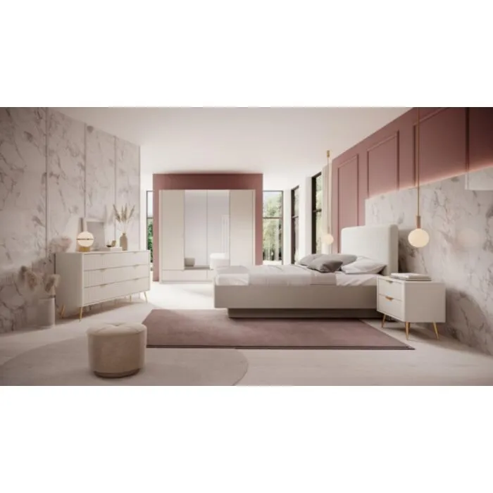Elegantna in moderna spalnica LILJA, je narejena iz odličnih materialov v barvi beige. Sestavljena je iz garderobne omare, komode, postelje z zabojom za shranjevanje in z dvema nočnima omaricama. V ceno je vključen dvižni pod. Narejena je iz MDF-ja in ima ABS rob. Ima kovinske ročaje in nogice v zlati barvi.