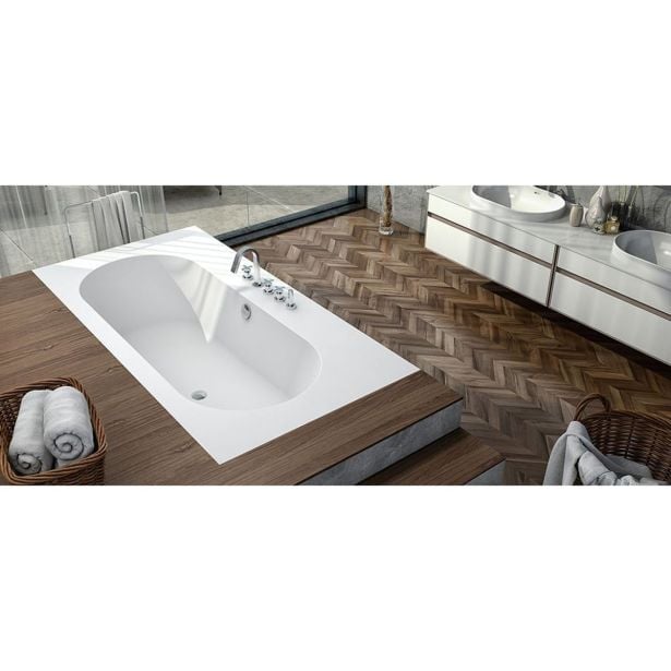 Kopalna kad iz Kerrock materiala, z odlivno-prelivno garnituro z UP&DOWN sistemom. Za vgradnjo na ploščice oziroma v nivo ploščic, možnost prirezovanja roba kadi.