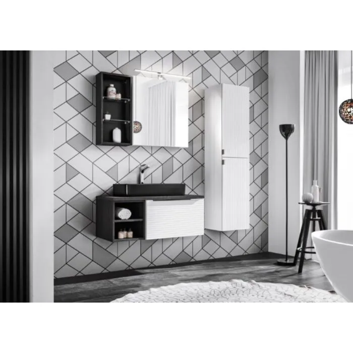 Kopalniški blok AURORA 90 je narejen iz kvalitetne laminirane plošče. V ceno je vključeno 1 x spodnji odprti poličnik, 1 x zgornji odprti poličnik, 1x LED lučka, 1 x omarica pod umivalnikom, 1 x omarica z ogledalom, 1 x visoka omara ter plošča pod umivalniki 90 cm. V omarah so police iz stekla. Lahko dokupite tudi umivalnik.