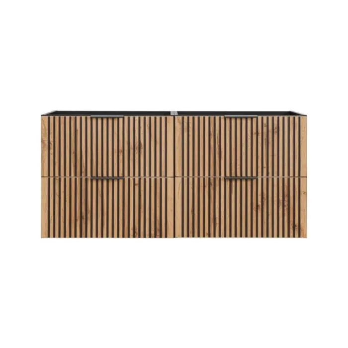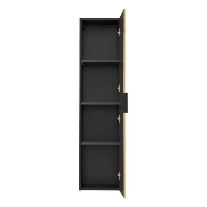 Kopalniški blok ILA 120 je izdelan v sodobnem dizajnu, ki združuje naravno lepoto hrastovega lesa s sodobno črno barvo. Osnovni element bloka je omarica za umivalnik, ki je izdelana iz kakovostne laminirane plošče s neverjetno čudovitim vzorcem lesa. V setu sta združeni dve omarici po 60 cm. Omarici sta izjemno praktični in uporabni, saj ponujajo veliko prostora za vso vašo kopalniško opremo. Poleg omaric za umivalnik je v kopalniškem bloku tudi visoka omarica, ki se odlično ujema z ostalim setom. Visoka omara je isto izdelana iz kvalitetne laminirane plošče s kombinacijo črne barve. Ponuja veliko prostora za shranjevanje vseh brisač, kozmetike ali drugih potrebščin. Kopalniški blok vsebuje mehko zapiranje, kar zagotavlja udobno in tiho uporabo. V setu je všteto tudi ogledalo s črno obrobo, ki se odlično zlije h celotnemu setu.