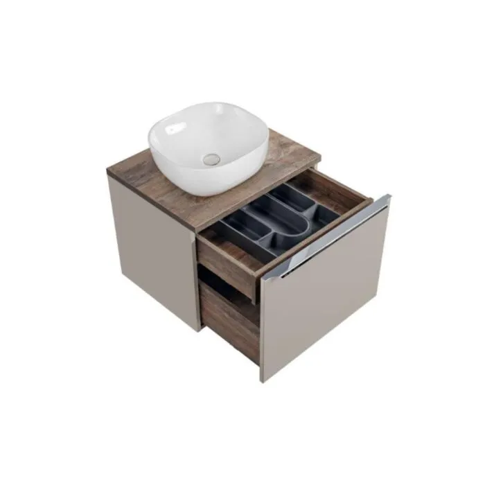Kopalniški blok KROKI 60 je oblikovan v modernem slogu, kar vam bo omogočala da ga lahko postavite v katero koli kopalnico in bo izgledal odlično. Taupe barve sprednjih strani in ohišja v kombinaciji s kromiranimi ročaji dajejo celotno lahkotnost in eleganco. Omarica z ogledalom dodatno optično poveča prostor in ponuja vam več prostora za shranjevanje vaših stvari. Poleg dobite tudi organizator predala. Vsebuje mehko zapiranje in steklene police v visoki omari ter omarah z ogledalom. Ima kromirane ročaje. Če želite LED luči dopišete v komentar. V ceno je vključeno 1 x visoka omara, 1 x omara pod umivalnikom, 1 x nadpultna plošča, 1 x omara z ogledalom. Če želite lahko dokupite tudi LED luči (+29€) in umivalnik.