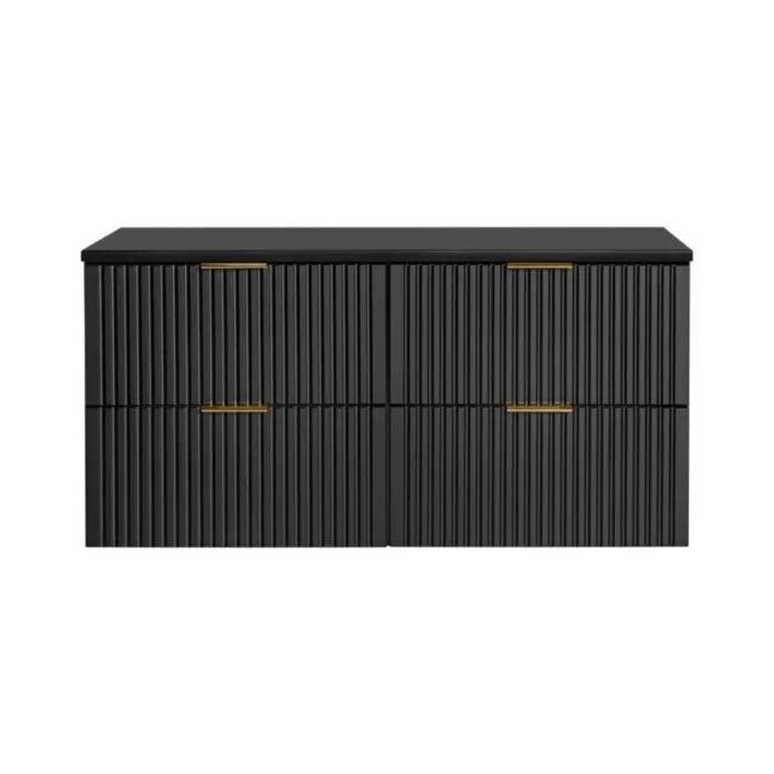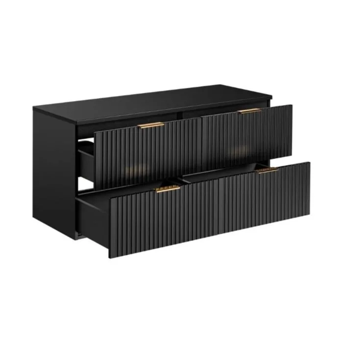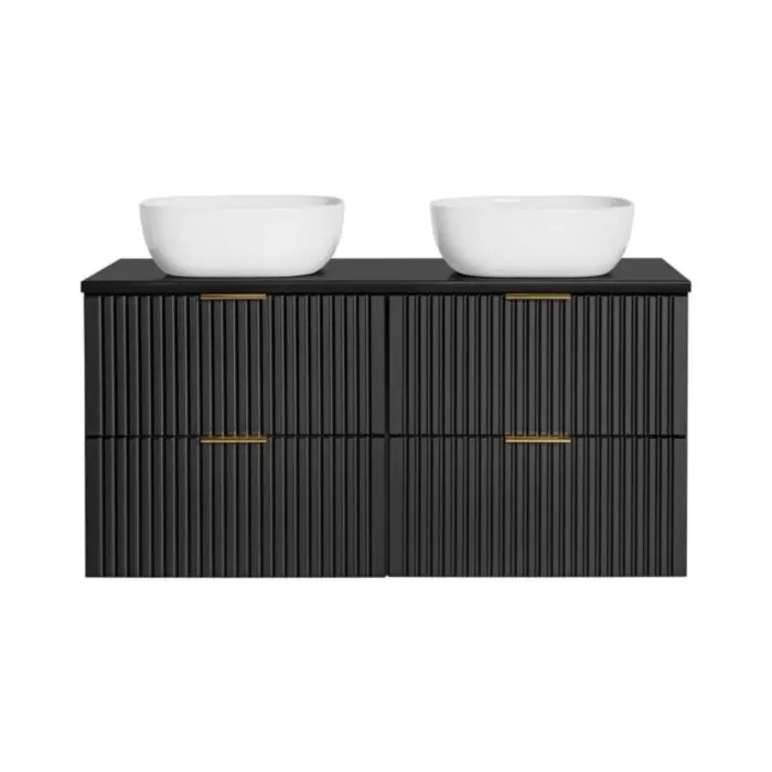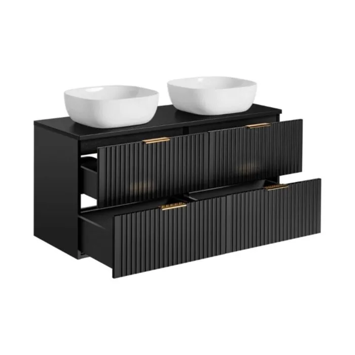 Kopalniški blok LUCIJA 120 2 je narejen iz kvalitetne laminirane plošče. Izstopa zaradi svoje moderne oblike s prefinjenimi zlatimi ročkami. Popestril bo vsako kopalnico. V ceno je všteto 2 x omarica za umivalnik, 1 x visoka omara, 1 x LED ogledalo ter po želji lahko dokupite umivalnik.
