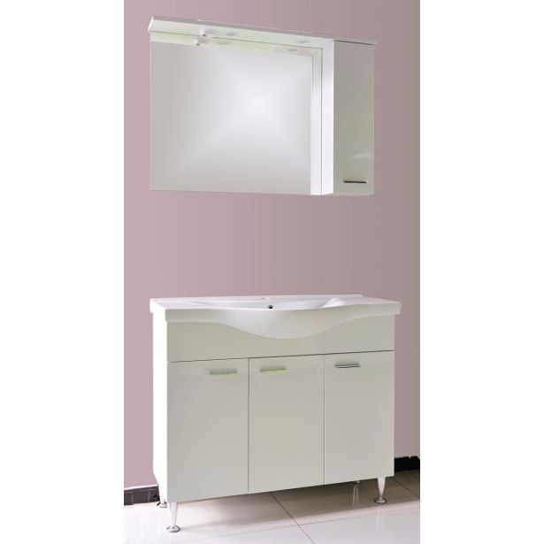 Kopalniški blok MEGALANT RONDA 100 v beli barvi. Sestavljajo ga omara, umivalnik in ogledalo.