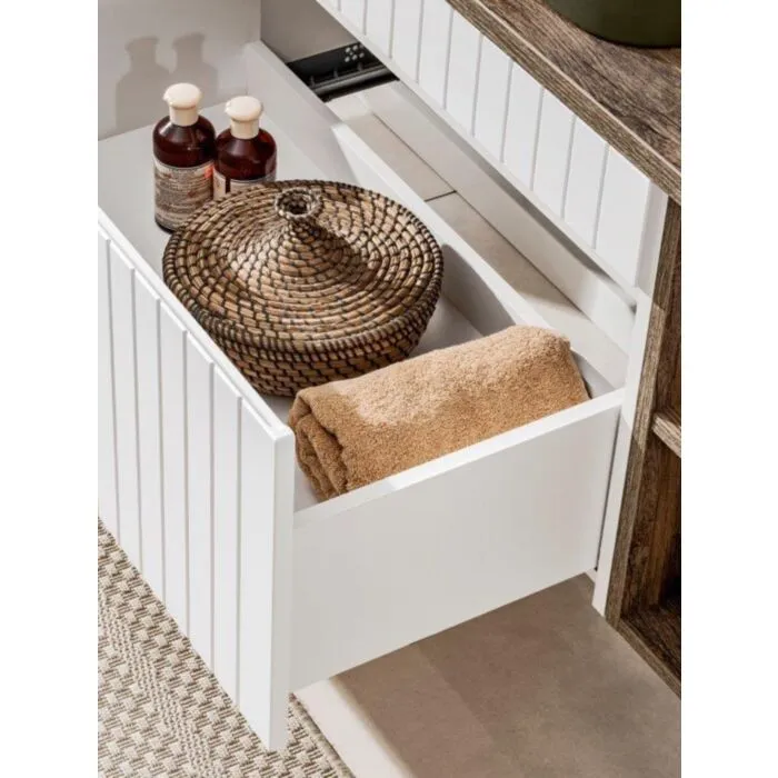 Kopalniški blok SUMMER 120 je hkrati enostaven in eleganten, odlikujejo ga vertikalne žlebovi in integriran oprijem – ta kombinacija naredi kolekcijo nežno in moderno. Beli elementi se podajo vsakemu stilu kopalniškega interierja. Kolekcija je zasnovana za ljudi, ki cenijo praktične rešitve v kombinaciji z edinstvenim slogom. V ceni je všteto: 1 x visoka omarica, 2 x omarica pod umivalnikom, 1 x LED ogledalo ter 1 x umivalnik. Kolekcija je narejena iz kvalitetne laminirane plošče, debeline 16 mm. Vsebuje mehko zapiranje.