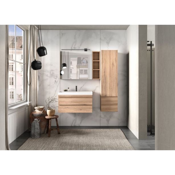 Kopalniško ogledalo s toaletno omarico Kolpa San iz linije Naomi je sestavljena iz trpežnih laminiranih plošč (LTD) iz oplemenitene iverne plošče, celotno sprednjo stran pa prekriva ogledalo.