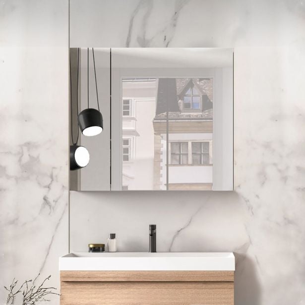 Toaletna omarica ima na prednjem delu vrat ogledalo, ki na spodnjem delu presega korpus omarice, kar nam omogoča enostavno odpiranje in zapiranje. Sami tečaji vrat so lahko nameščeni na levi ali desni strani, tako da lahko prilagodite odpiranje kopalniške omarice po svojih željah.