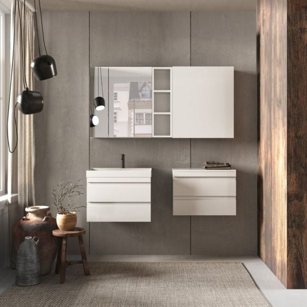 Kopalniško ogledalo s toaletno omarico Kolpa San iz linije Naomi je sestavljena iz trpežnih laminiranih plošč (LTD) iz oplemenitene iverne plošče, celotno sprednjo stran pa prekriva ogledalo.