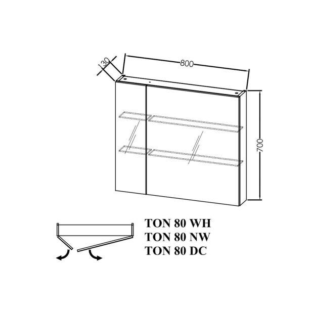 Kopalniška omarica z ogledalom Kolpa San TON 80 DC iz linije Naomi ima na sprednji strani ogledalo preko celotne površine. Notranjost je predeljena z dvema policama. Dimenzija omarice z ogledalom je 800 x 700 x 130 mm.