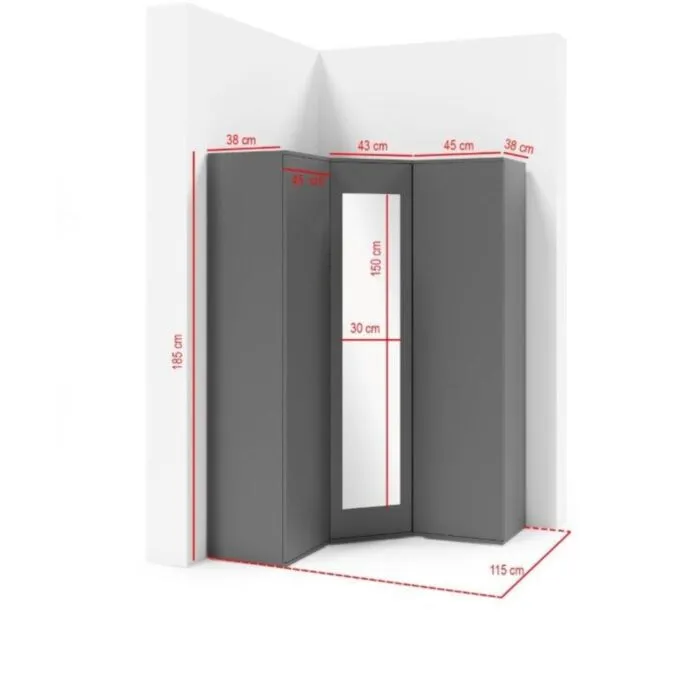 Kotna garderobna omara EMILI je izvirna in stilska. Izdelana iz laminirane plošče. Na voljo v več barvah. Garderobna omara je opremljena z ogledalom.