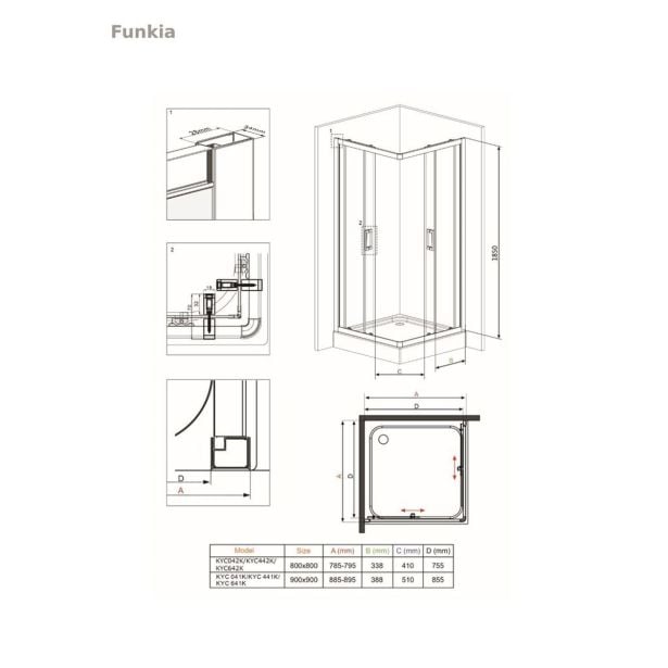 Kotna tuš kabina Funkia KYC 041K – 90 cm, z 5mm kaljenim prozornim steklom in srebrnimi profili. Odlikujejo jo magnetna tesnilna zapirala, ki zagotavljajo enostavno in tiho zapiranje.Sama montaža pa je enostavna in prilagojena potrošniku!