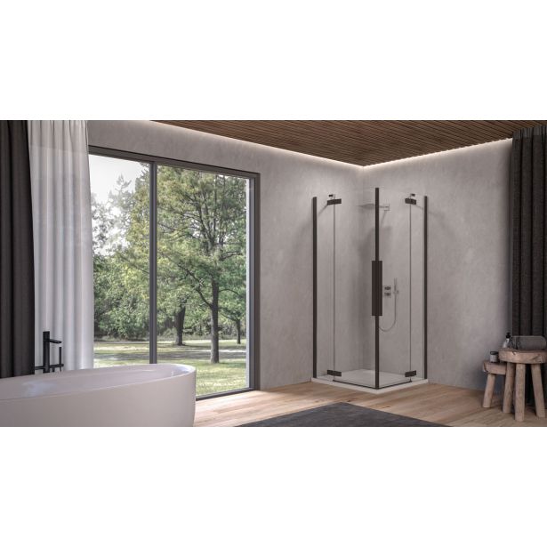 Kotna tuš kabina Polaris s črnimi profili, kaljenim prozornim steklom debeline 8/6 mm, Clean coat zaščitnim premazom. Vhodna odprtina 79 cm.