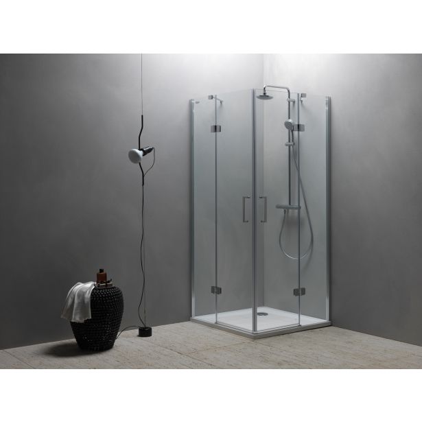 Kotna tuš kabina s kaljenim prozornim steklom debeline 6 mm in srebrnimi profili.
