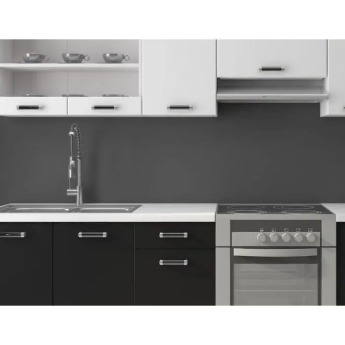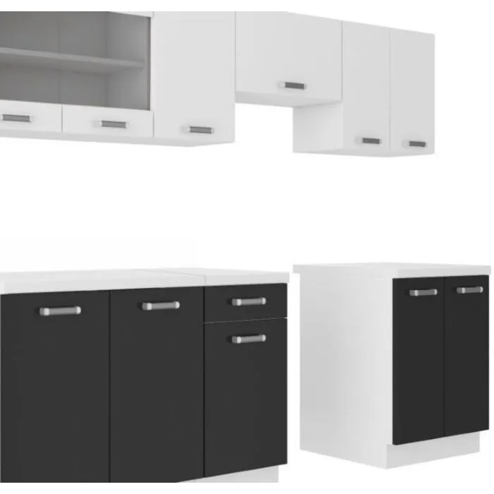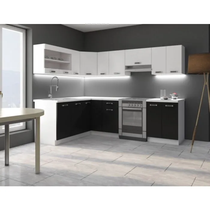 Kuhinja DELTA 170 x 250 cm je kuhinja, ki bo prinesla svežino v vaš dom. Dobavljiva v kombinaciji črne in bele mat barve. Možnost dobave tudi drugih dimenzij. Debelina delovnega pulta je 28 mm. Kuhinja je izdelana iz oplemenitenih ivernih plošč debeline 16 mm in je oblečena v dekor, kateri jo ščiti pred vlago in ima visoko odpornost na praske.