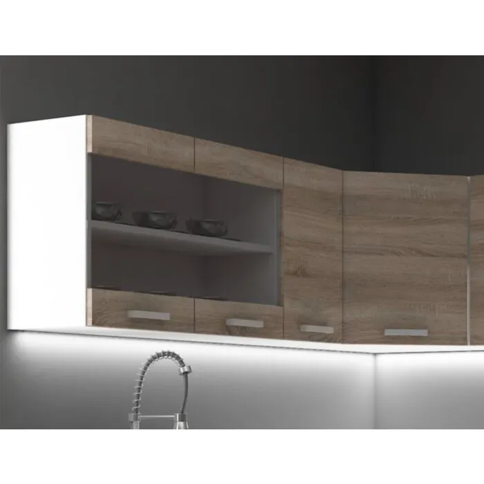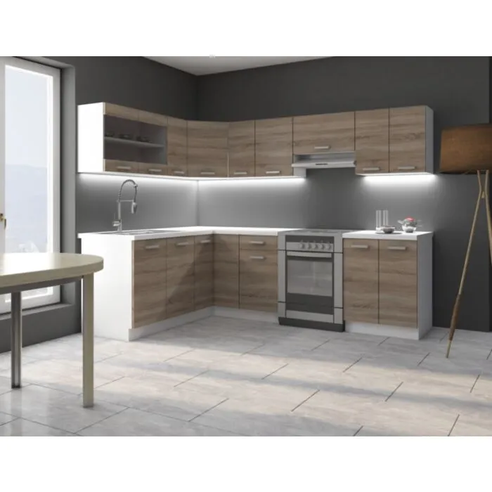 Kuhinja META 170 x 250 cm je kuhinja, ki bo prinesla svežino v vaš dom. Dobavljiva v kombinaciji sonoma in bele barve. Možnost dobave tudi drugih dimenzij. Debelina delovnega pulta je 28 mm. Kuhinja je izdelana iz oplemenitenih ivernih plošč debeline 16 mm in je oblečena v dekor, kateri jo ščiti pred vlago in ima visoko odpornost na praske.