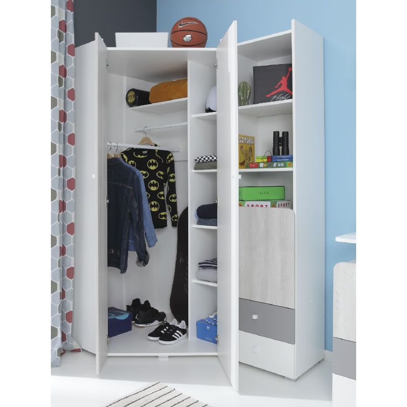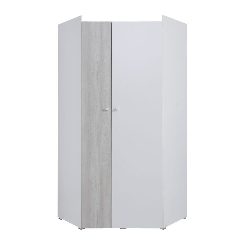 Kotna omara iz kolekcije COMO v prelepih barvnih kombinacijah bele, sive in belega hrasta. Dimenzije: 90 / 190 / 90 cm.
