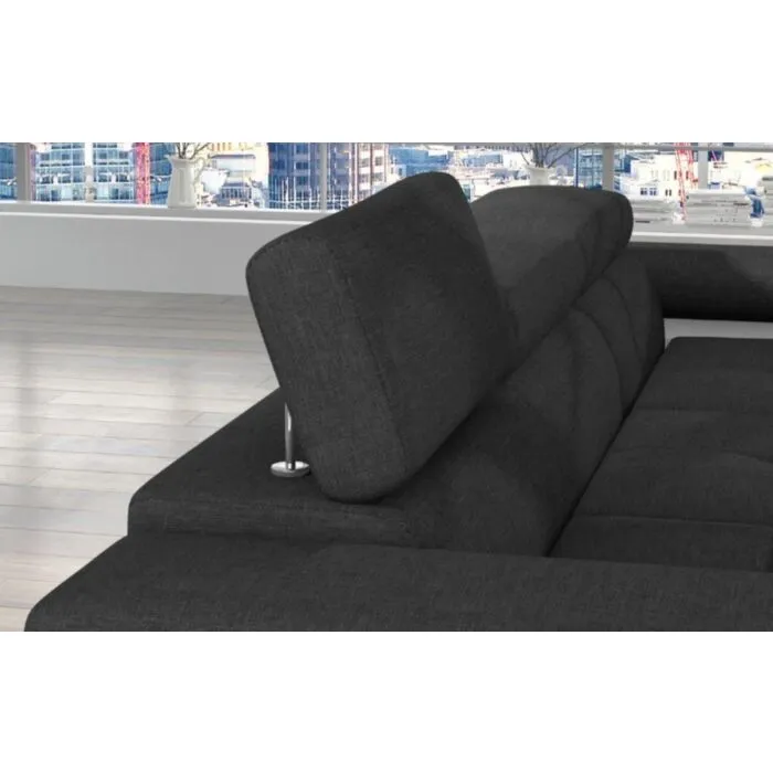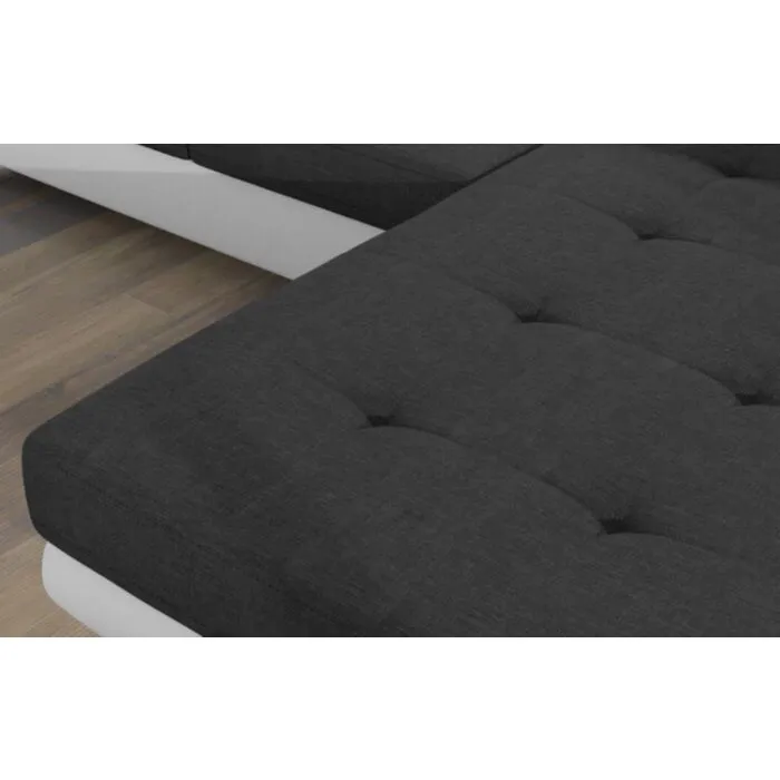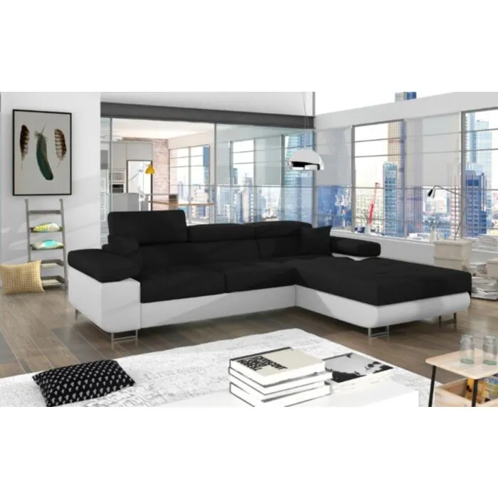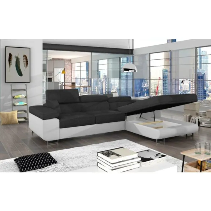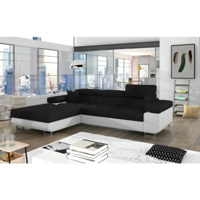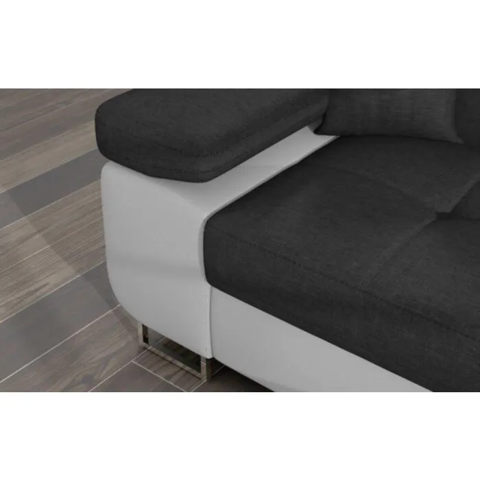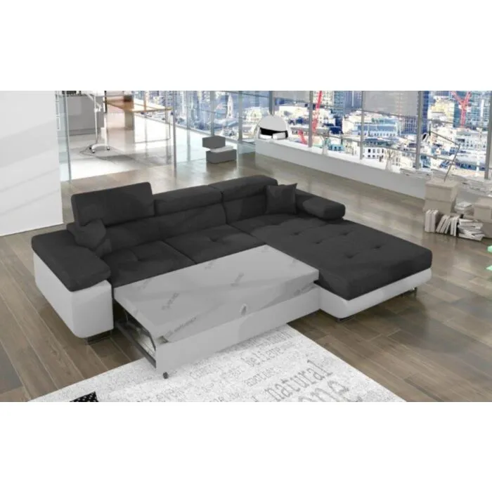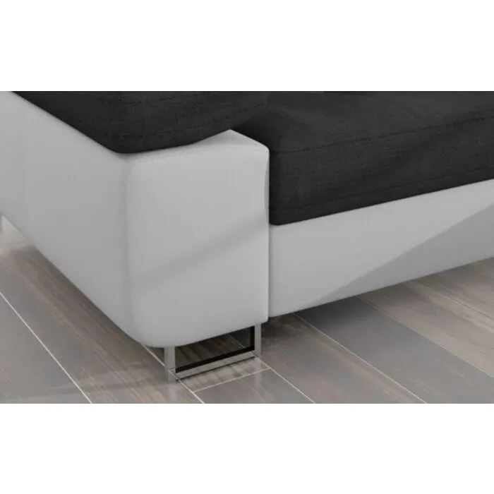 Kotna garnitura ARON 2 je kotna sedežna garnitura, katera je narejena iz umetnega usnja in blaga. Garnitura se raztegne v ležišče z mehanizmom delfin. Ima zaboj za shranjenavnje posteljnine in nastavljive vzglavnike. Garnituri pripadata okrasni blazini. Sedežna je vzmetena z valovitimi vzmetmi. Garnitura ima levi ali desni kot, katerega je potrebno izbrati. Moderne linije vas bodo prepričale.