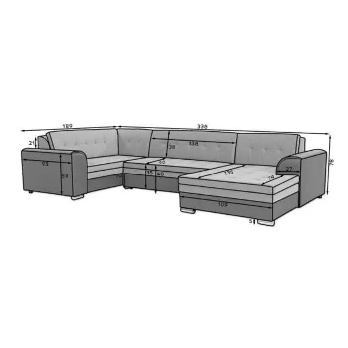 – D: 338 cm x G: 189/167 cm x V: 78 cm