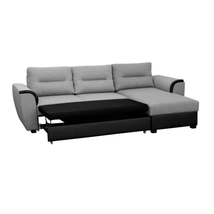 Kotna sedežna garnitura ENEJ je zelo praktična in funkcionalna. Narejena je v kombinaciji kvalitetnega umetnega usnja in blaga. Garnitura ima levi ali desni kot, katerega morate izbrati. Garnitura je vzmetena z valovitimi vzmetmi. Raztegne se v dodatno ležišče ter vsebuje zaboj za shranjevanje posteljnine.
