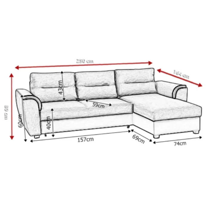 – D: 250 cm x G: 164 cm x V: 80 cm