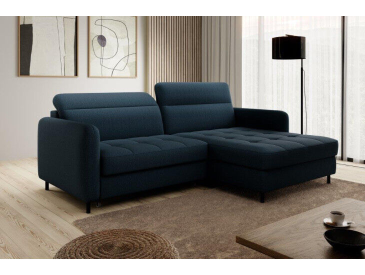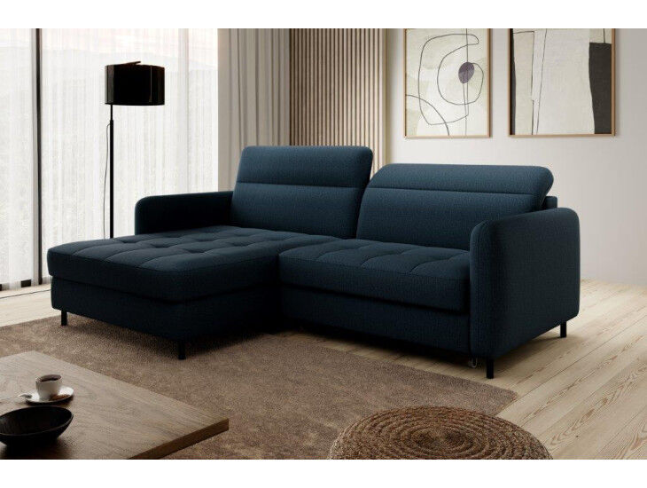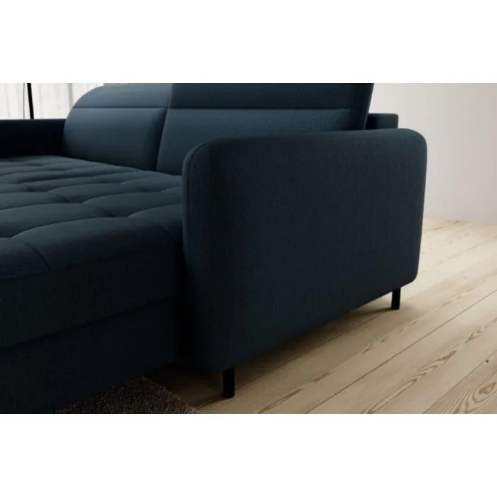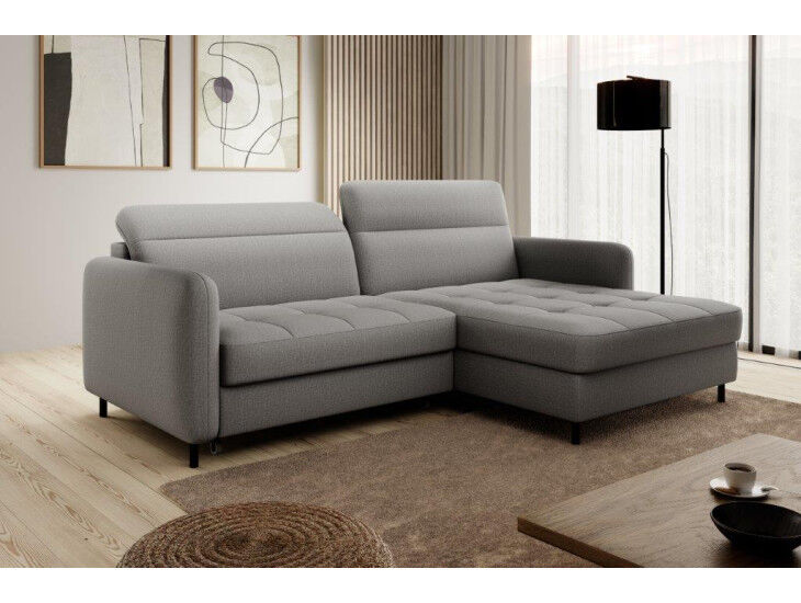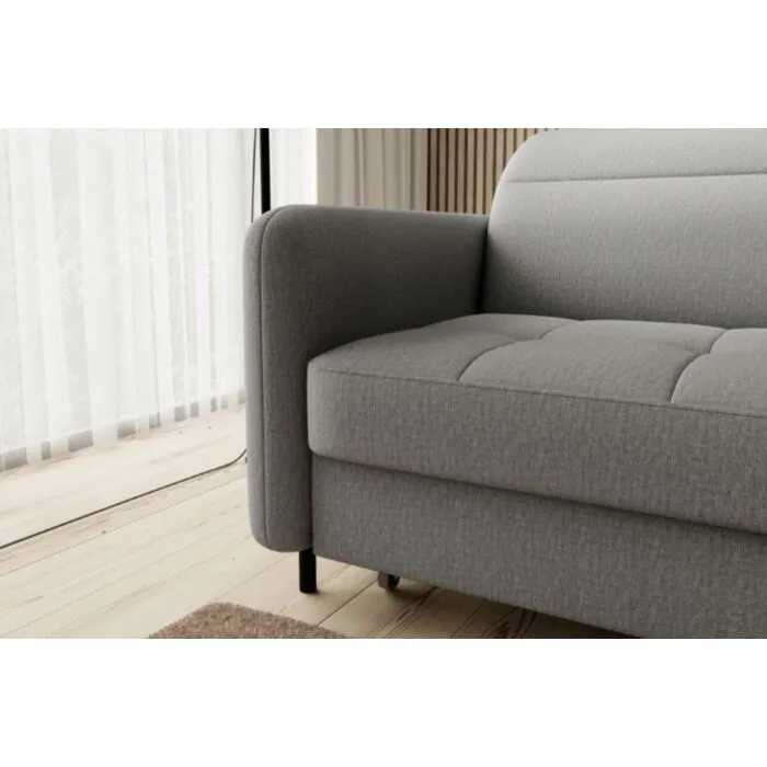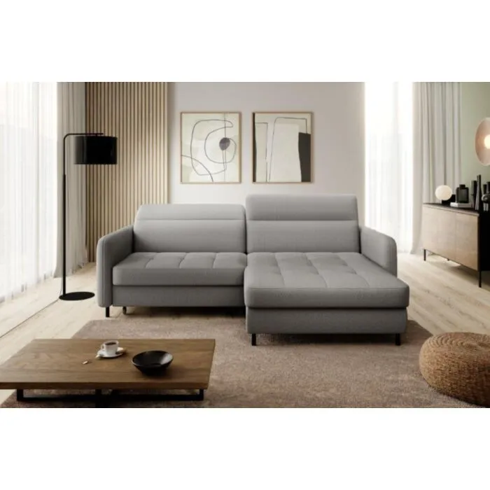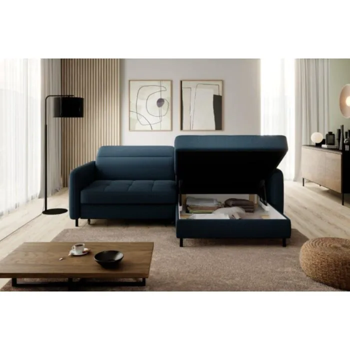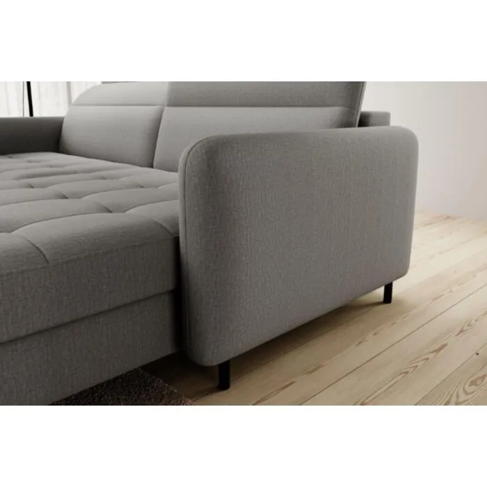 Kotna sedežna garnitura GABY je manjša sedežna garnitura, ustvarjenja za manjše prostore, vendar zato nič manj elegantna in moderna. Sedežna garnitura je vzmetena z valovitimi vzmetmi v kombinaciji s peno. Nastavljivi vzglavniki bodo omogočali še večjo udobnost. Garnitura se raztegne tudi v dodatno ležišče z delfin mehanizmom ter vsebuje zaboj za shranjevanje posteljnine. Elegantne kovinske nogice so v črni barvi.