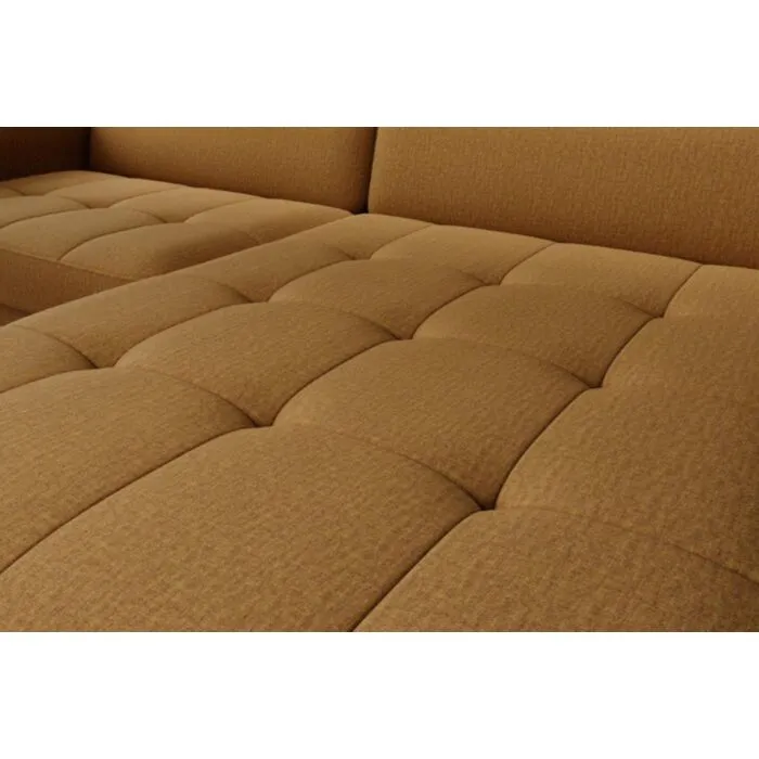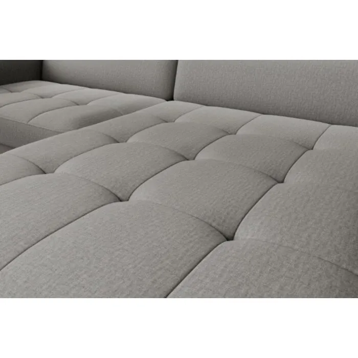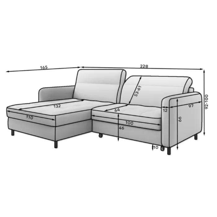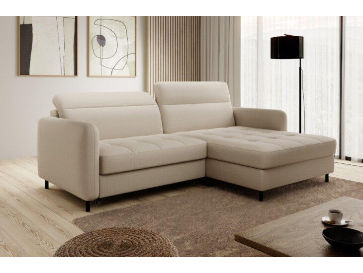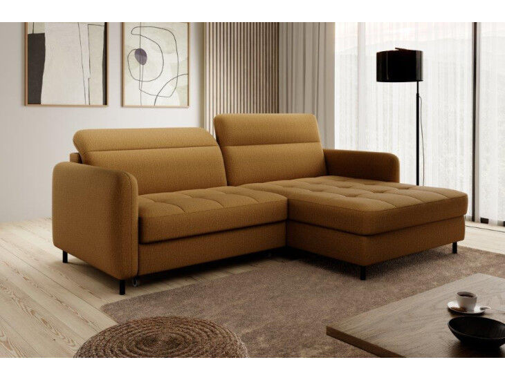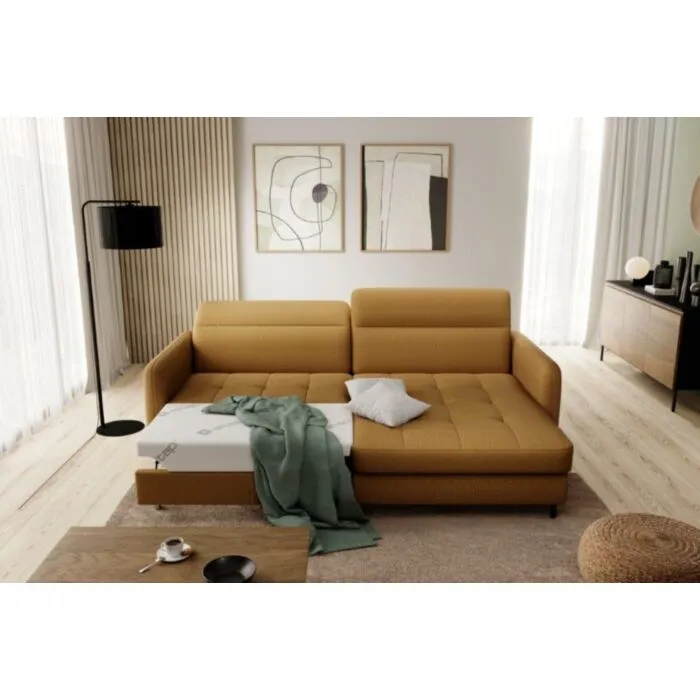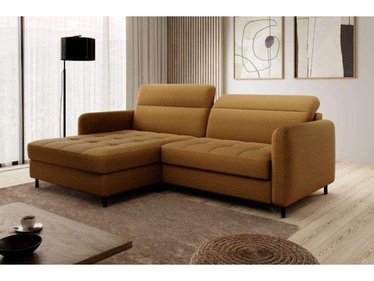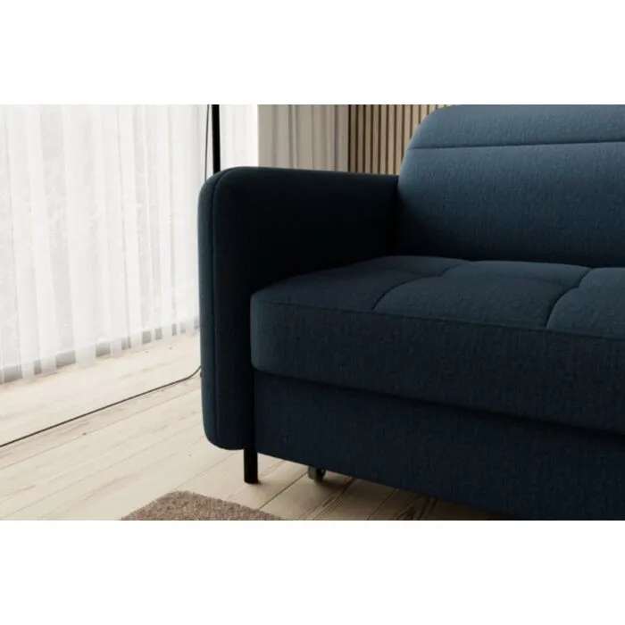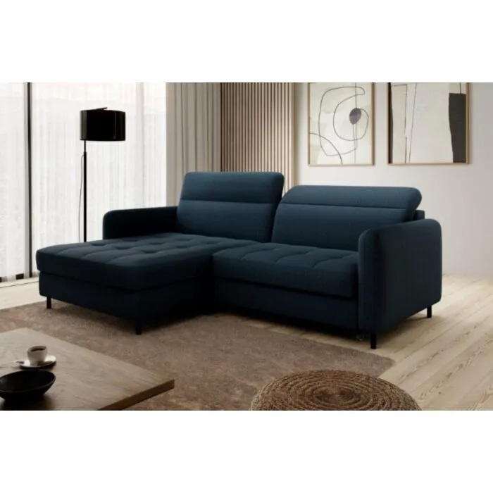 Kotna sedežna garnitura GABY je manjša sedežna garnitura, ustvarjenja za manjše prostore, vendar zato nič manj elegantna in moderna. Sedežna garnitura je vzmetena z valovitimi vzmetmi v kombinaciji s peno. Nastavljivi vzglavniki bodo omogočali še večjo udobnost. Garnitura se raztegne tudi v dodatno ležišče z delfin mehanizmom ter vsebuje zaboj za shranjevanje posteljnine. Elegantne kovinske nogice so v črni barvi.
