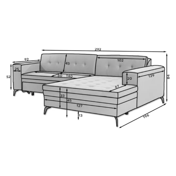 – D: 292 cm x G: 196 cm x V: 84 cm