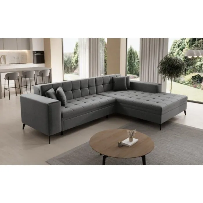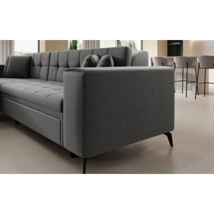 Kotna sedežna garnitura JON je modernega dizajna. Na voljo je v več barvah. Primerna je za vsak prostor. Sedežni je potrebno določiti levi ali desni kot. Prednost je tudi spalna funkcija katera se raztegne z dolphin mehanizmom. Sedež je izdelan iz valovite vzmeti in kombinacije visoko elastične pene, ki bo zagotovo pripomogla k udobnemu počitku.