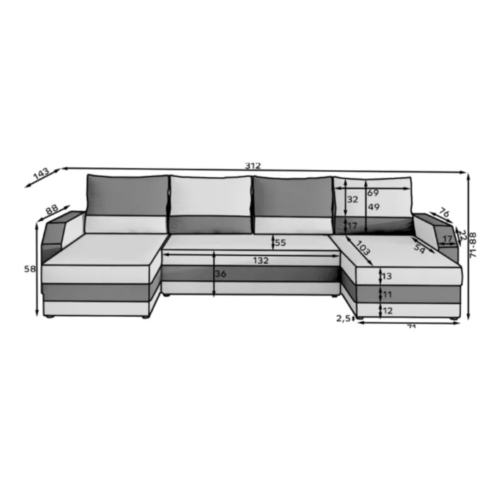 – D: 312 cm x G: 143 cm x V: 71 / 88 cm